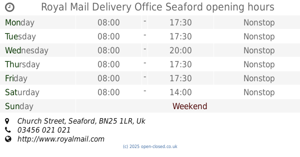 It is also possible to : Edit these OPENING HOURS of Office Royal Mail Delivery Office In Seaford, Church Street,